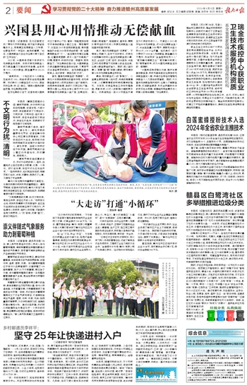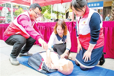 4月3日,定南县历市镇农民街广场,志愿者在为群众讲解应急救护知识。据悉,本次 “大爱无疆,生命延续”——“三献”知识主题宣传活动由该县红十字会举办,旨在为群众普及无偿献血、造血干细胞捐献、器官捐献、应急救护等医疗知识和应急救护技能,提高市民在紧急情况下的自救互救能力。 钟杰 摄