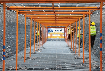 4月3日,施工人员在深江铁路中国铁建大桥局中山制梁场进行预制箱梁钢筋绑扎。日前,深江铁路全线第一榀预制箱梁在中国铁建大桥局中山制梁场完成浇筑,全线进入箱梁预制阶段。深江铁路是我国“八纵八横”高铁网沿海通道的重要组成部分,线路起自深圳西丽站,正线全长116公里,跨越珠江口,串联深圳、东莞、广州、中山和江门等大湾区5座中心城市。该工程建成后,深圳与江门可实现1小时内通达,深圳与广州南沙自贸片区可实现半小时高铁互联互通。新华社记者刘大伟 摄