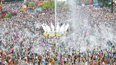 4月15日,人们在景洪市泼水广场上参加泼水狂欢活动。当日,云南省西双版纳傣族自治州举行泼水狂欢活动,人们欢聚在景洪市泼水广场,用相互泼水的方式互送祝福,庆祝泼水节。新华社记者王静颐 摄