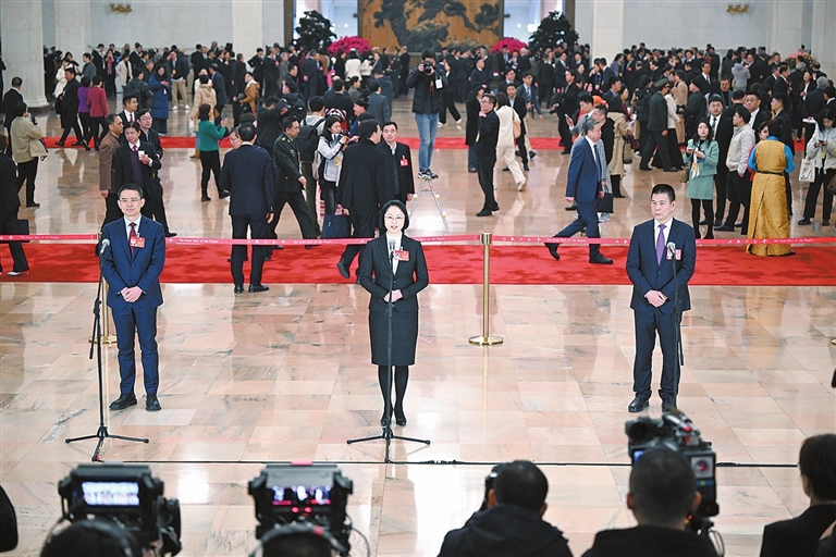 3月10日上午,人民大会堂中央大厅北侧,全国政协十四届二次会议第三场“委员通道”集体采访活动在这里举行。