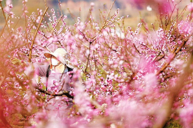 3月17日,在云南省曲靖市沾益区盘江镇河西村桃园基地,果农在果园进行管护作业。 新华社发 (孙文来 摄)