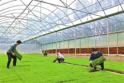 眼下正值水稻育秧的关键时期,瑞金市依托17个乡镇的水稻工厂化育秧中心,开展工厂化育秧工作,让科技助力水稻种植跑出“加速度”,为农民育好苗,种好田奠定基础,助推该市农业产业高质量发展。图为3月25日,瑞金市农技人员在云石山乡育秧大棚查看秧苗生长情况。邓浩亭 邓诗怡 摄