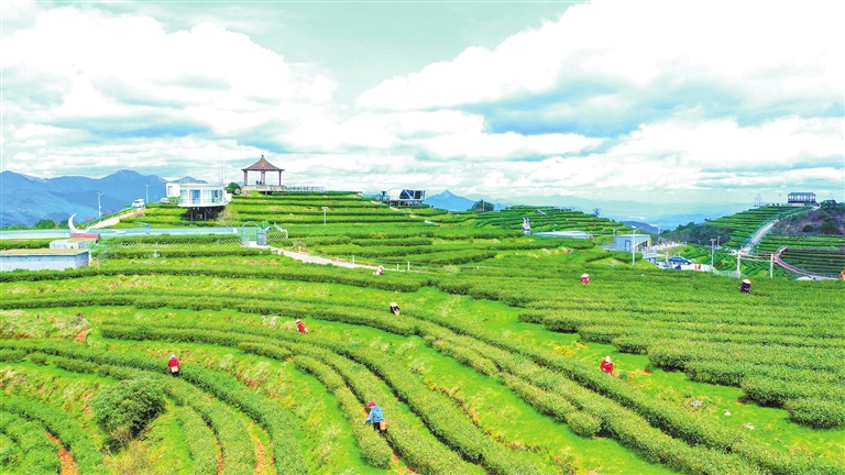 近日,在崇义县万长山茶园,采茶姑娘们双手在茶树间娴熟地翻飞,抢抓有利时节采摘第一波高山春茶。崇义县以景区思维打造生态富硒茶园,以茶带旅、以旅促茶,茶旅共融,推进乡村振兴。曾刘洲 摄