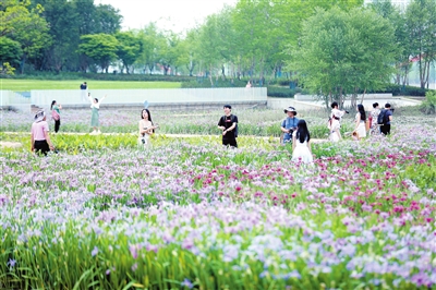 4月15日,市民在赣州蓉江新区新世纪运动公园拍照打卡。目前,该公园里成片的鸢尾花和月见草竞相开放,成为一道美丽的风景,吸引许多市民前来游园赏花,享受春光。 见习记者伍煜 通讯员钟万汕 摄