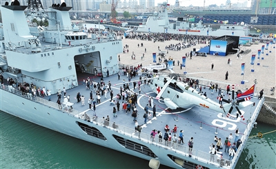 4月21日,青岛港3号码头,观众在参观综合补给舰可可西里湖舰(前)(无人机照片)。今年4月23日是海军成立75周年纪念日,4月20日至24日,海军在青岛、大连、烟台、上海、厦门、广州、湛江、海口、三亚等地海军部队组织军营开放活动,其中在青岛港3号码头、青岛奥帆中心码头安排6艘舰船向社会公众开放。 新华社记者李紫恒 摄