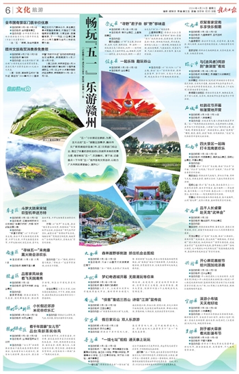 “五一”小长假近在眼前,为满足大众的“五一”假期出游需求,赣州市文广新旅局组织各县(市、区)文旅部门和企业,推出了丰富的游玩活动以及前所未有的优惠力度,等你畅玩“五一”,乐游赣州。接下来,记者盘点一下今年“五一”我市各地文旅活动,以助力广大市民玩得更省心、更开心!