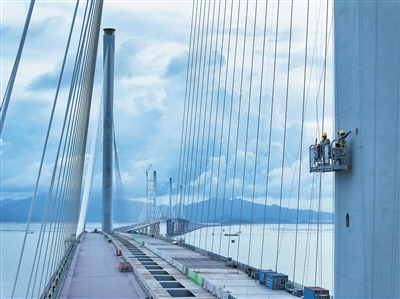 7月16日,中交路建施工人员在黄茅海跨海通道高栏港大桥东索塔进行涂装前清理(无人机照片)。每座索塔将进行六遍涂装。目前,中交路建承建的黄茅海跨海通道高栏港大桥已经进入索塔塔身涂装施工,被誉为海上“小蛮腰”的索塔单座涂装面积近万平方米。黄茅海跨海通道是粤港澳大湾区又一超大型跨海工程,连接珠海市和江门市,线路全长约31公里。跨海段由高栏港大桥和黄茅海大桥两座主桥组成,项目预计2024年年底通车。新华社记者刘大伟 摄