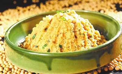 食品制作剩下的边角料也可“华丽变身”。客家人一向勤劳节俭,所以,大豆磨成浆,可做豆浆,豆浆凝固后压制,可做豆腐,那做豆腐剩下的豆渣,自然也要拿来做美食。豆渣若直接入口,当然难吃,所以也要经过一道重要的工序——霉,即发酵。赣州人似乎格外青睐“霉”这一烹制手法。这或许与赣州气候潮湿,易生菌丝有关。总之,豆渣经过霉制,便被赋予了独特风味。辣椒葱花将其炒散,自有香气生出,喜欢者频频下筷子;也有“奢侈”一些的,加入蒜叶子、花生碎、鸡蛋碎等,口感更具变化,滋味也更上一层楼。
