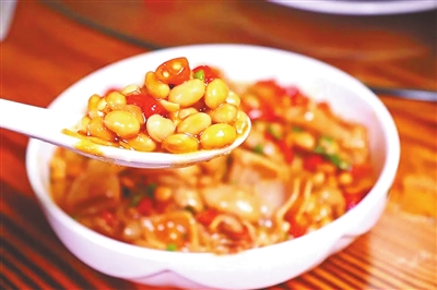 用调味料来充当菜品的“主色调”。豆豉,一种很常见的大豆制品,据说起源于战国时期前后,在《楚辞·招魂》中就有相关记载,到西汉便已形成规模,早于豆腐的出现。不过,在赣州,人们更喜欢霉豆子这种同样发酵而成的调味料,其做法与霉豆腐颇为相似。不同于豆豉咸香味重的硬朗,霉豆子显得更加柔软,具有亲和力。将霉豆子与姜、辣椒混作一团,稍加腌制,成就微臭香辣的滋味,既可以加上蒜叶炒制成“搭筷子”的常菜,又可以与大肠、腰花等各类猪下水构成一盘让人欲罢不能的下饭菜。
