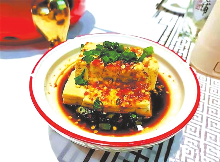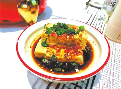 首先要推荐的是盐蛋豆腐——赣州的臭豆腐。臭豆腐这种闻着臭吃着香的食物,大家自然不会陌生,但是比较常见的臭豆腐,不论制作方式有如何不同,最终形态都是干硬结实的,大多油炸而成。而在赣州,这臭豆腐的外表犹如一方水豆腐,色若羊脂玉,滑润又娇嫩,仿佛美人雪肌不可轻易触碰,又有酱汁铺底、葱绿椒红点缀其上,一勺热油浇下,轻微的臭味扬起,倒更令人垂涎。盐蛋豆腐的原料便是水豆腐,但是经过卤水的浸泡,就有了截然不同的风味。筷子轻轻一夹,那盐蛋豆腐就如雪散开,所以,稍微讲究些的,便会将盐蛋豆腐切成若干小块,轻蘸酱汁,放入口中,微抿即化,那臭味就成了唇齿留香。若说油炸臭豆腐是一位气味霸道的横刀怒马的侠客,盐蛋豆腐便是一位暗散“幽香”的清冷淑女。前者需要搭配味厚的酱汁,再加上柔软顺滑的海带与脆爽辣口的萝卜干,一副热热闹闹的景象;后者你只需云淡风轻地细细品尝,慢慢回味。所以,吃油炸臭豆腐你会害怕上火,吃盐蛋豆腐却是清凉解毒。