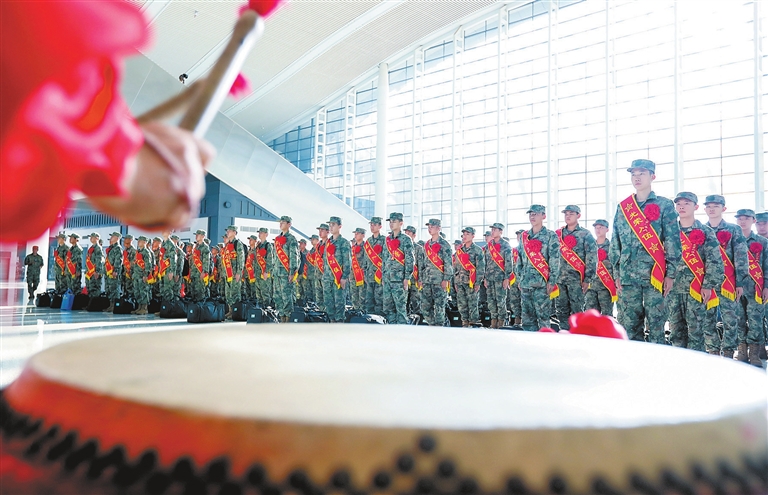 9月18日,赣州西站候车大厅锣鼓喧天,110余名新兵胸戴红花、肩披“光荣入伍”绶带,个个身姿挺拔、精神抖擞,在父老乡亲的夹道欢送下,意气风发地踏上了从军的征程,分赴祖国各地军营,追逐梦想,奉献青春。今年下半年,我市适龄青年积极响应祖国召唤,踊跃报名参军,经过层层选拔,共有1700余名优秀青年被批准入伍,大学毕业生征集比例超过70%。记者邹忠辉 通讯员刘宗炎 摄
