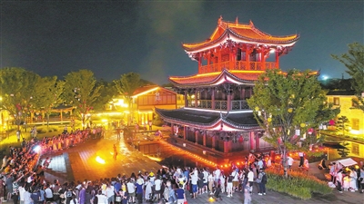 九月十六日,游客在章贡区七鲤古镇旅游景区内游玩。中秋假期,章贡区七鲤古镇旅游景区灯光璀璨、热闹非凡,游客和市民纷纷来到这里赏夜景、看非遗、品小吃,乐享多彩假期生活。特约记者胡江涛 摄