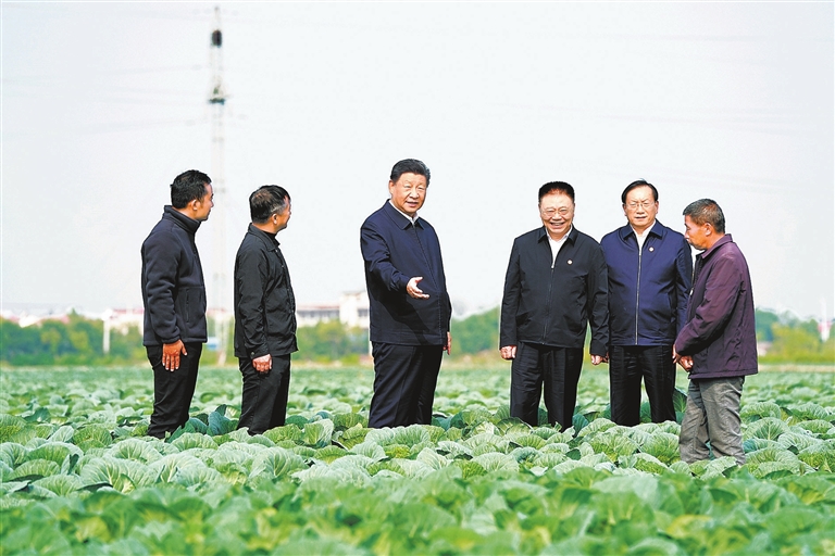 5日上午,习近平前往咸宁市嘉鱼县,首先到潘家湾镇十里蔬菜长廊考察。深秋时节,这里仍然满目青翠、生机勃勃。习近平走进田间,察看蔬菜长势,详细询问蔬菜品种、种植技术、销售等情况。他强调,农村天地广阔,农业大有可为。发展现代农业,建设农业强国,必须依靠科技进步,让科技为农业现代化插上腾飞的翅膀。他勉励当地干部群众走科技之路、质量之路、品牌之路,把蔬菜种植这个富民产业进一步做好,让更多群众增收致富。