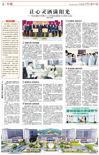 回首来路尚犹新,展望前程春满园。站在新的历史起点上,赣州市第三人民医院将继续坚持党建引领,锚定“一九六四”发展战略。在建设健康中国的征程中,该院将全面提高能力,切实为人民提供全方位全周期健康服务,让心灵洒满阳光。