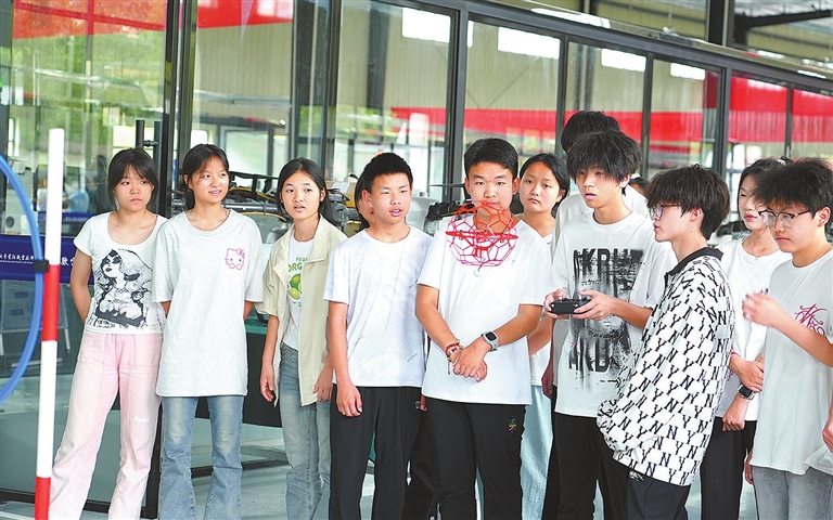 5月16日,赣州市前沿职业技术学校的学生在灵活操控无人机起飞、穿梭、降落。当日,该校举行职业教育活动周暨科学教育开放日活动,聚焦人工智能、工业机器人、新能源汽车等前沿领域,展现“科技+职教”特色,为培养新时代高素质技能人才注入新动能。