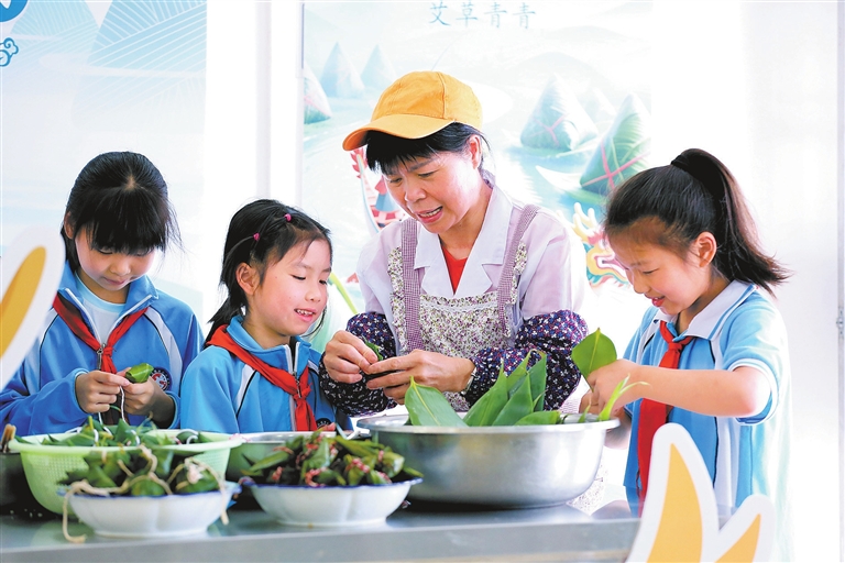 5月27日,大余县池江中心小学学生在体验包粽子。当日,该小学举行“包粽子 迎端午”活动,让孩子们在学习包粽子活动中了解端午传统民俗,感受传统文化的独特魅力。特约记者叶功富 通讯员彭青芸 摄