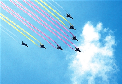 分列式尾声,7架战机划出14道彩烟,寓意中华民族14年可歌可泣的抗战历程,象征14亿多中国人民奔向强国复兴的绚丽前景。