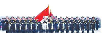 全体肃立,80响礼炮震彻云霄,国旗护卫队官兵护卫着五星红旗,迈着矫健的步伐,从人民英雄纪念碑行进至广场北侧升旗区。中国人民解放军联合军乐团奏响雄壮的《义勇军进行曲》,全场齐声高唱中华人民共和国国歌,鲜艳夺目的五星红旗冉冉升起,在天安门广场上空高高飘扬。