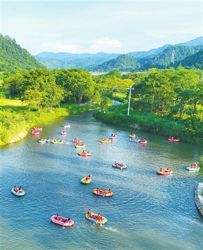 近日,游客在信丰县小江镇中兴村龙之梦欢乐谷漂流戏水,乐享清凉。近年来,当地立足生态资源优势,打造了生态漂流、跑马体验、溯溪划船、生态采摘等特色旅游项目,带动村民在家门口吃上“旅游饭”,助力乡村全面振兴。特约记者李健 通讯员邹晨逸莹 摄